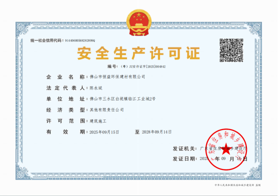 9月15日,佛山電建集團有限公司下屬企業(yè)佛山市恒益環(huán)保建材有限公司(簡稱:環(huán)保建材公司)獲得住房和城鄉(xiāng)建設(shè)廳頒發(fā)的建筑施工類安全生產(chǎn)許可證。目前,環(huán)保建材公司已擁有“建筑業(yè)企業(yè)資質(zhì)證書(施工勞務(wù))”和“安全生產(chǎn)許可證”等重要資質(zhì),不僅說明了環(huán)保建材公司具備相應(yīng)的專業(yè)資質(zhì)與能力,也是環(huán)保建材公司技能水平提升的重要體現(xiàn),為其服務(wù)業(yè)務(wù)提供了更堅實的支撐。